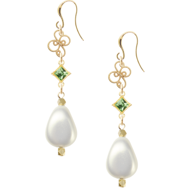 アラベスクパーツと、スクエア型スワロフスキーを合わせました。パール (ユリア樹脂変形)とペリドットのコントラストが綺麗なピアスです。