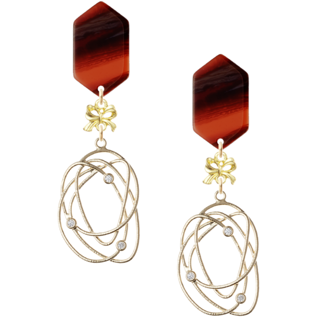 カラフルなべっ甲風ピアスベースにラインストーンを施した宇宙空間的なパーツをリボンにセットし、華やかなデザインに仕上げました。
